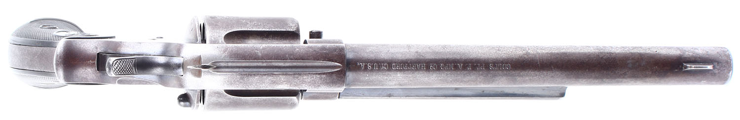 Colt, 1878, CAL: 38-40, MFG: 1898, SN: 38471, Double Action Revolver. 7 1/2'' barrel. Checkered synthetic grips are in good condition with very little handling wear but a large crack on the bottom of the right grip panel. The original bluing has worn and toned to a thin brown patina with some gun metal grey and splotches original bluing on low wear areas, most notably the top and bottom of the ejector housing and the inside of the frame beneath the cylinder. Markings on the top of the barrel read Colts PT. F. A. MFG Co Hartford CT. U.S.A.. Bore is good, rifling has darkened with even roughness and some pitting. Mechanically solid with very little play in the cylinder after the trigger has been depressed. Front blade sight integral to the barrel, rear sight trough is cut into the top of the frame. Antique, no FFL Req. - Value: 700 to 1400