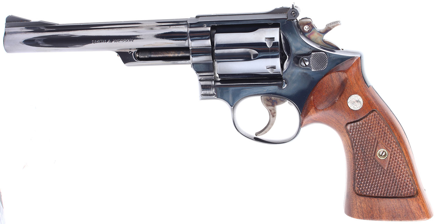 BOXED Smith & Wesson, Model 53, CAL: 22 JET/22LR. MFG: 1961. SN: K462168, Double Action Revolver. 5 7/8 barrel. The factory checkered wood grips with S&W medallions are in excellent condition with very light handling wear. The factory blued finish rates 98% with very light handling wear and a small ding on the right side of the barrel. Bore is excellent. Mechanically solid, the cylinder has very little side to side & back & forth play. Blacked out target sights, serrated front ramp sight is integral to the barrel, windage and elevation adjustable rear sight is screwed to the top of the frame. Comes in a Smith and Wesson model 53 cardboard box (Not serially matching) with a full set of 22 LR sleeves for the 22 JET cylinder and a dedicated 22 LR cylinder. FFL or C&R Req. - Value: 1000 to 2000