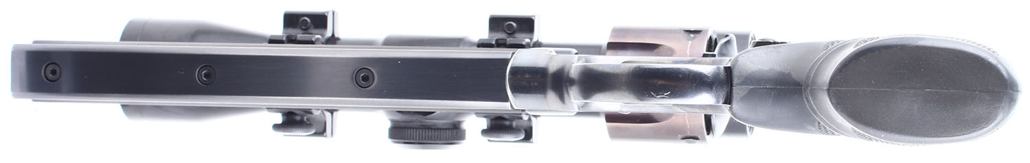 Smith & Wesson, Custom Target Model 14-4, CAL: 38 S&W. MFG: 1981. SN: 97K3469, Double Action Revolver. 7 1/2 barrel. The checkered rubber grips are in very good condition, they are solid but have substantial handling wear. The bluing rates 99% with very light wear, the bluing on the cylinder has toned to an even plumb patina, the case hardening on the hammer and trigger is very good with some handling wear. Bore is excellent. Mechanically very solid, the cylinder has some side to side & back & forth play. This gun has been rechambered in 38 S&W, it has a bull barrel, and Weaver pistol scope mounted to it. FFL Req. - Value: 500 to 1000