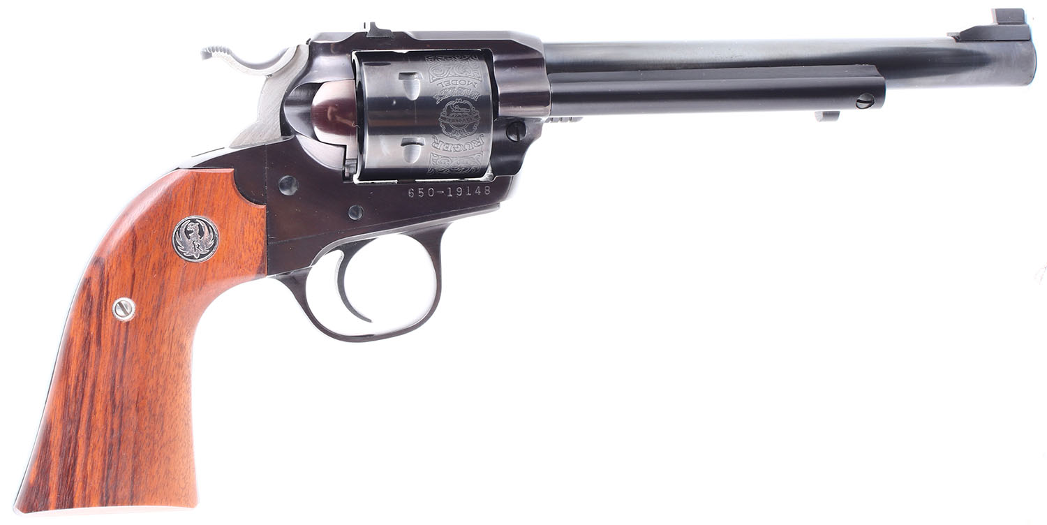 BOXED Ruger, New Model Single Six Bisley, CAL: 32 H&R MAG. MFG: 1986. SN: 650-19148, Single Action Revolver. 6 1/2 barrel. The factory wood grips with Ruger medallions are in excellent condition. The bluing rates 98% with light rust speckling. The cylinder has factory engravings. Bore is excellent. Mechanically solid, the cylinder has very little side to side & back & forth play. Blacked out target sights, the rear sight is set in a dovetail cut on the frame, the serrated front sight is screwed to the barrel. Comes in a factory Ruger cardboard box with an owners manual and other related paperwork. FFL Req. - Value: 650 to 950