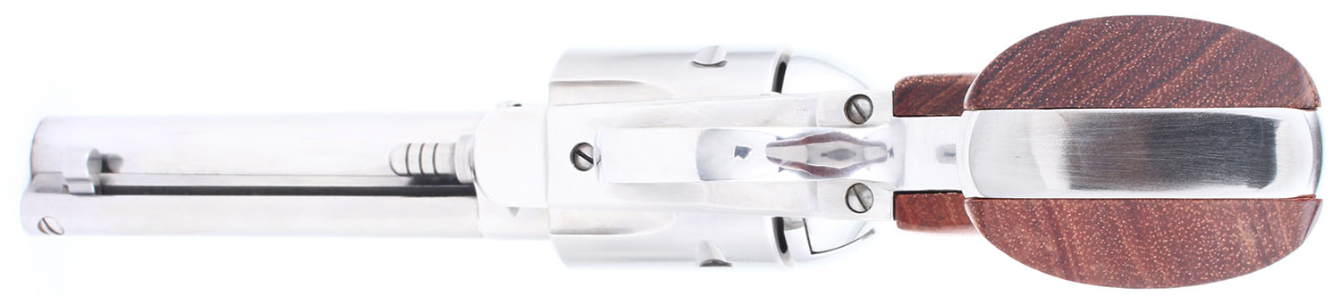 CASED Ruger, Vaquero, CAL: 44 MAG. MFG: 2001. SN: 58-02361, Single Action Revolver. 4 1/2 barrel. The factory wood grips with Ruger medallions are excellent with very light handling wear. The factory nickeled finish is excellent with very light wear. Bore is excellent. Mechanically solid, the cylinder has some side to side & back & forth play. Rudimentary sights, serrated front blade sight is integral to the barrel, rear trough sight is cut into the frame. Comes in the serially matched factory Ruger hard case with an owners manual and other related paperwork. FFL Req. - Value: 550 to 1100