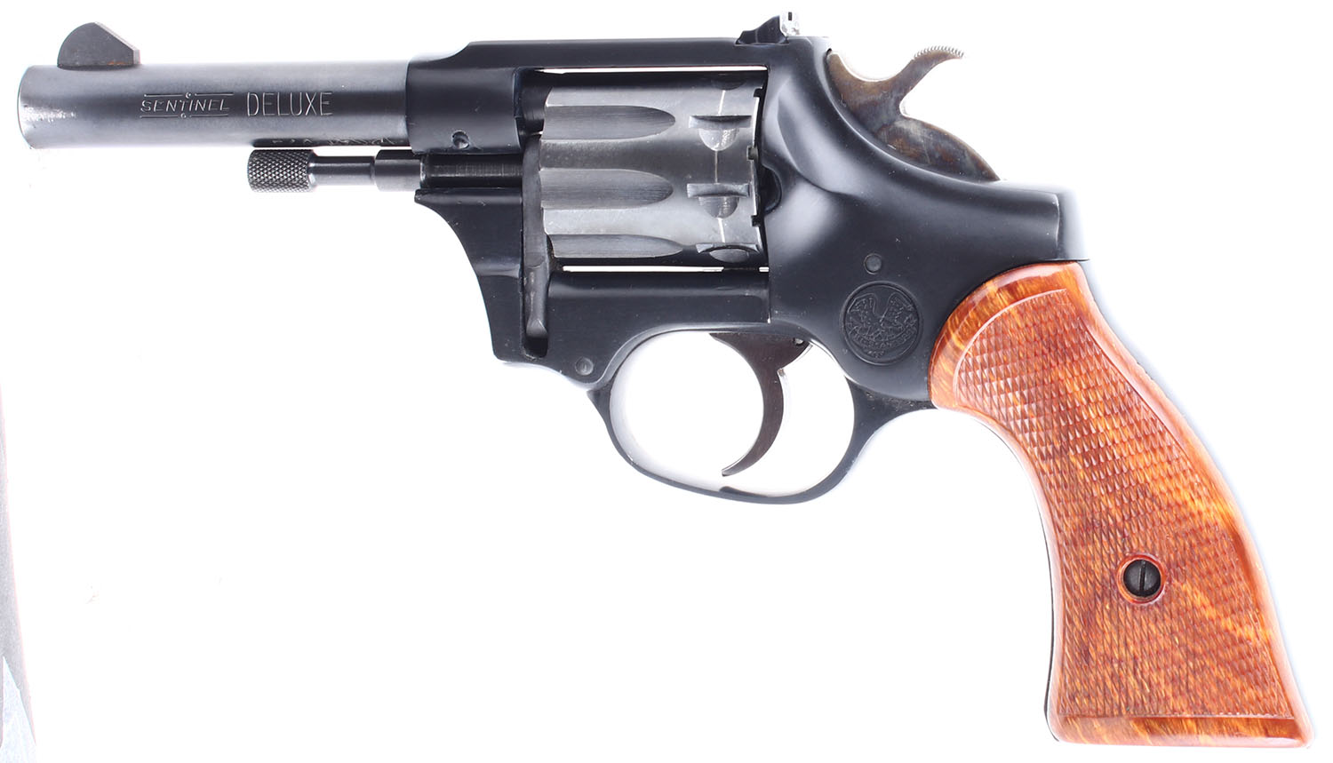 High Standard, Sentinel Deluxe, CAL: 22 LR. MFG: 1964. SN: 1498264, Double Action Revolver, 4'' barrel. The checkered plastic grips are in excellent condition with very light handling wear. The bluing on the gun rates 98% with light wear. The case hardening on the hammer is excellent. Bore is excellent. Mechanically solid, the cylinder has some side to side & back & forth play, the cylinder lock up when the trigger is fully depressed is incredibly tight. Blacked out sights, the rear sight is set in a dovetail cut on the frame, the front sight is integral to the barrel. FFL or C&R Req. - Value: 200 to 400