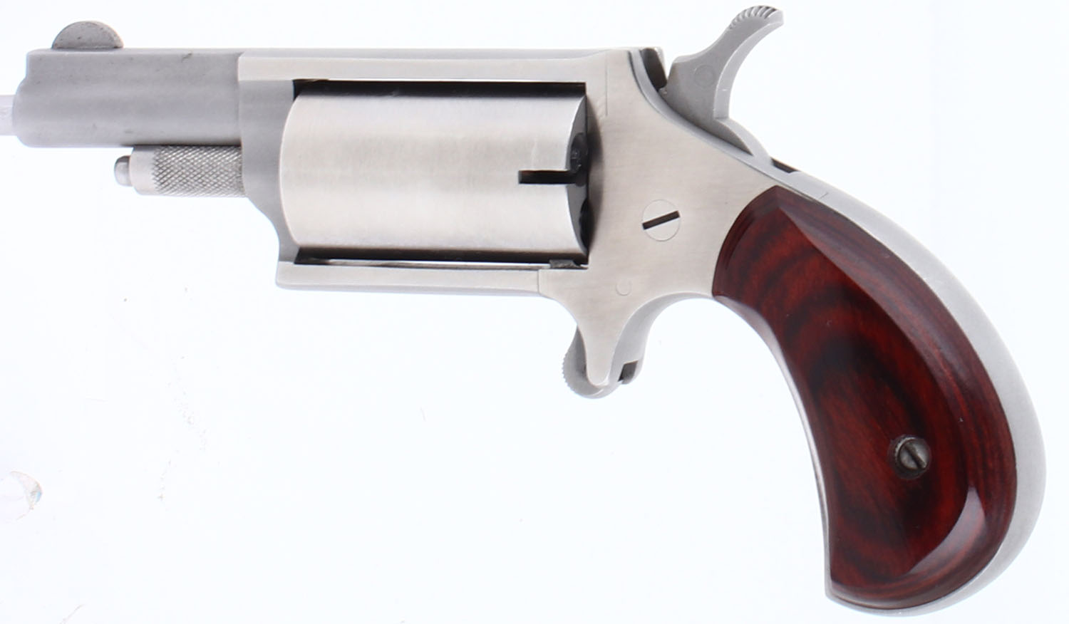 North American Arms, Companion (.22 MAG Sized frame), CAL: .22 Black Powder, MFG: Modern. SN: U1859, Single Action Revolver, 1 1/2'' barrel. The factory wood grips are in excellent condition with little to no wear. The stainless finish on the gun is in very good condition with very slight rust speckling on the barrel. Bore is excellent. Mechanically solid, the cylinder lock up is very tight. Rudimentary sights, front blade sight is integral to the barrel, rear sight notch cut into the frame. Black Powder, No FFL Req. - Value: 150 to 350
