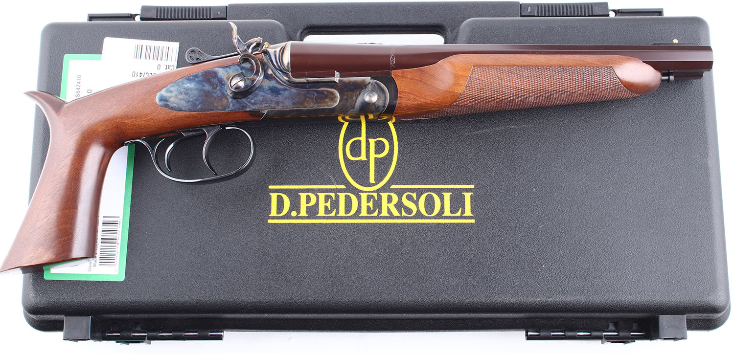 CASED D. Pedersoli, Howdah Vintage, CAL: 45 LC/410 GA, MFG: Modern. SN: HV00205, Side by Side Double Barrel, 10'' barrel. The wood grip and checkered wood forend are in excellent condition with minimal wear, there is one small edge chip on the bottom of the grip. The browned finish on the barrel rates 99%. The bluing on the trigger guard, triggers, and top lever rates 99%. The case hardening on the frame and hammers is excellent. Bores are excellent, like new. Mechanically very solid, seems to function well. Brass front sight bead is mounted to an elevated platform between the barrels, rear sight is set in a dovetail cut between the barrels and held in with two screws. Comes in the serially matched hard plastic case with an owners manual. FFL Req. - Value: 1500 to 2500