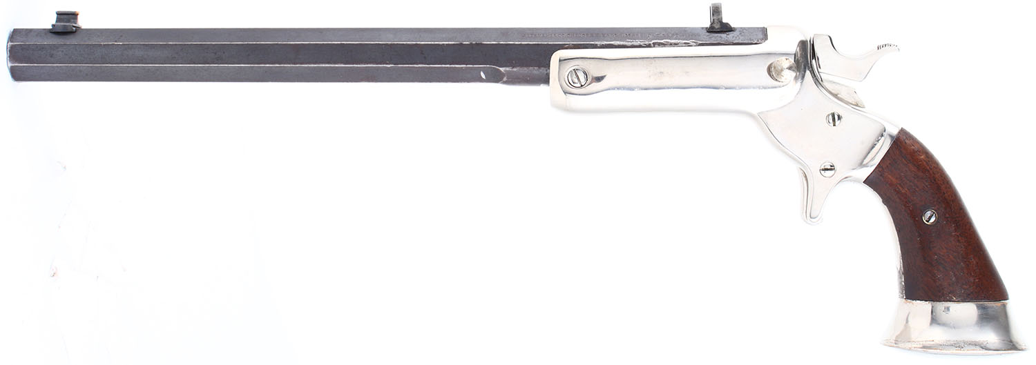 HISTORY: these mid to late 1800's target rifles were meant to be portable, light weight, and accurate. They have stocks that slide into a dovetail cut on the bottom of the grip and are secured by a screw in the back of the grip, this one was converted to a target pistol. These antique ''Pocket Rifles'' are specifically exempt from the NFA and do not require an SBR tax stamp even though they have a short barrel and a stock.