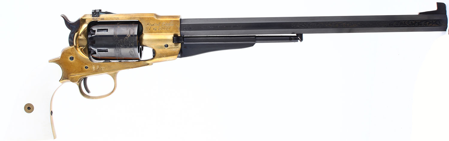 CASED SET, F.LLI Pietta, 1858 Buffalo Revolvers Limited Edition 1 of 5000, CAL: 44, MFG: Modern, SN: TSG1466/TSG1465, Percussion Muzzleloader Pistols, 12'' barrels. Both revolvers are perfectly matching. The grades that follow are for both revolvers. The faux ivory grips are excellent. The metal blue finish on the barrel & cylinder rates 99%. The barrel has 6'' of floral scroll engraving on both sides & the cylinders have a buffalo & gunman scene. The polished brass frames are excellent. The case-hardened hammers are excellent. Bores are excellent. Adjustable rear sight & tall blade front sight. Marked ''LIMITED EDITION 1 OF 5000''. Mechanically excellent. Both revolvers come in a factory wood presentation case, with red interior & glass top. A nice blackpowder set. Blackpowder, No FFL Req. - Value: 600 to 1000