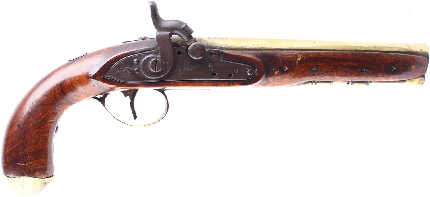 HISTORY: John Sharpe was a prolific maker of export-quality guns & pistols from 1811 to 1831. Cheap flintlock belt pistols, often with brass barrels marked ''EXTRA PROOF'' by Sharpe are fairly common. They were normally used as ship weapons & for personal defense. Sharpe was not one of the original sixteen contractors for the war, but he clearly was either a subcontractor or a Board of Ordnance maker just after the War of 1812. Sharpe apparently had contracts with the North West Company & other trading firms around 1818, to supply N.W.C with guns.