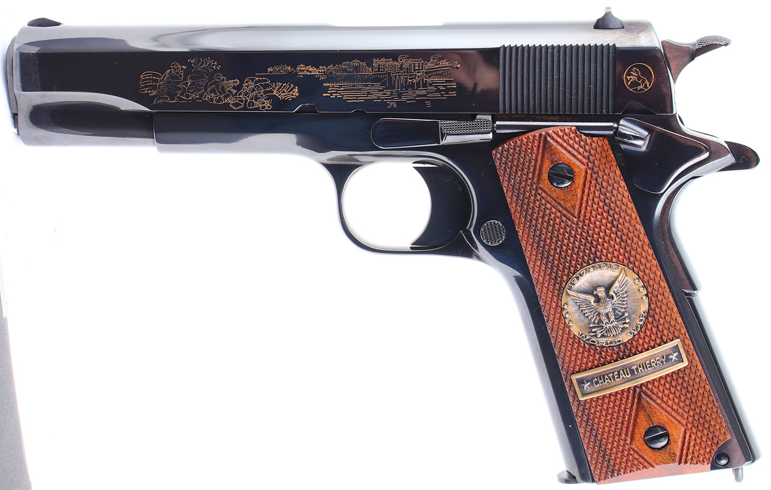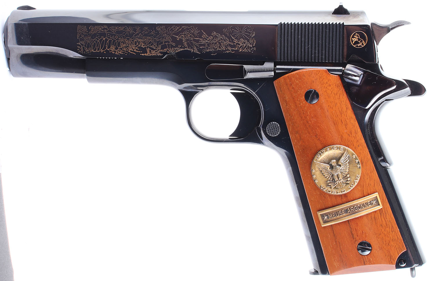 The WWI 1911's all have a blued finish and wood grips holding custom medallions. The medallion on the right grip panels have a depiction of a soldier with a rifle standing atop a hill with markings reading ''U.S.A.'' above the soldier with ''France Italy Serbia Japan Montenegro Russia Greece Great Britain Belgium Brazil Portugal Rumania (sic) China'' on either side, and a banner reading ''The Great War For Civilization'' below. The left grip panels have a medallion with an eagle with ''1917-1918'' marked above and ''World War'' below. There are small straight placards below the medallions on the left grip panels that mark the names of the battles the guns commemorate.