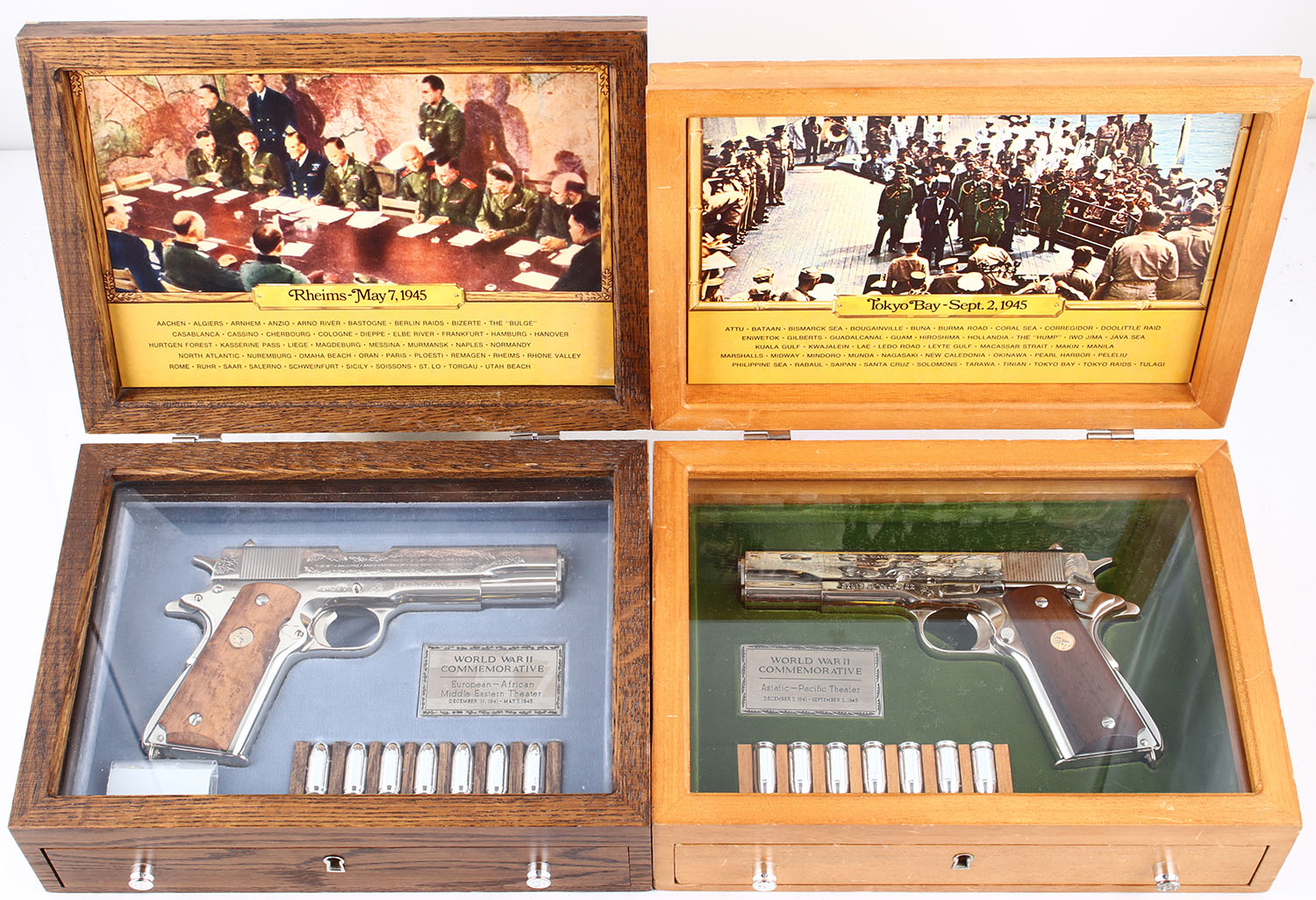 RARE CASED Full set of six serially matching World War commemorative Colt Government Model 1911 and 1911A1 pistols. These guns have high luster blued and nickeled finishes, they commemorate major battles in which the US participated during World War I and the two theaters of operation in WWII. This is an extremely rare set. Many sets of serial matching WWI pistols exist as do matching sets of WWII pistols. WWII sets serial matched to a WWI set were only offered to those who originally purchased the WWI sets and were only made for those who accepted the offer. To find a set with all six pistols, serial matching, is incredibly rare. According to Rock Island Auctions only 7,400 WWI sets were made with only 75 matching WWI & WWII sets being produced.
