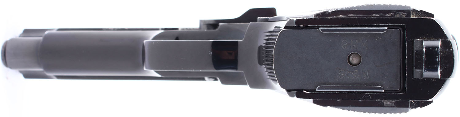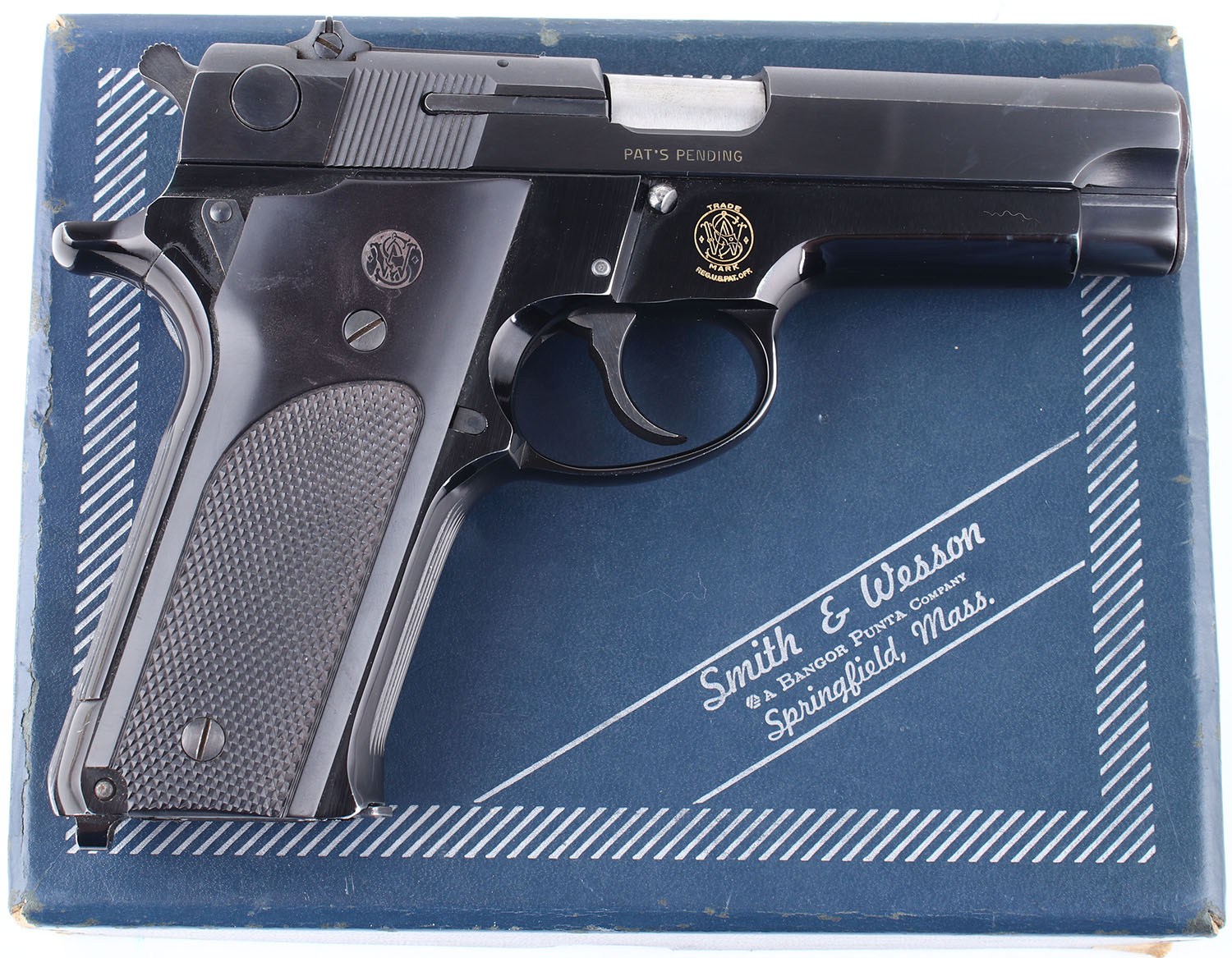 BOXED Smith & Wesson, 59, CAL: 9x19mm, MFG: 1974-75, SN: A241787, Semi Auto Pistol. 4'' barrel. Checkered plastic grips are in very good condition with slight handling wear and some rust in the grip screws. The black finish on the frame rates 97%, and slide rates 98%. Bore is excellent. Mechanically solid with very little side to side play in the slide. Blacked out sights, front serrated post sight is integral to the slide, windage adjustable black rear sight is set into a dovetail cut. Comes in a factory box with two magazines, cleaning rod and brush, and users manual. FFL or C&R Req. - Value: 300 to 600