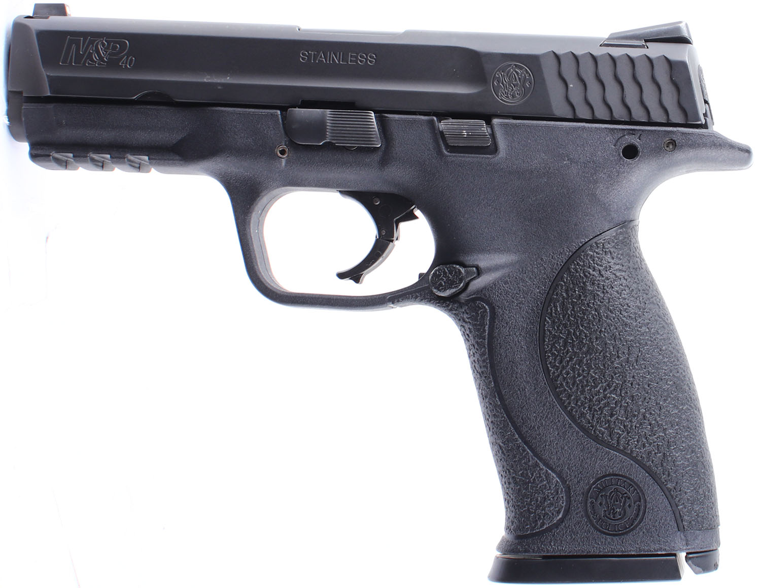 CASED Smith & Wesson, M&P40 Stainless, CAL: 40 S&W, MFG: Modern, SN: MPF3671, Semi Auto Pistol. 4'' barrel. The textured plastic grip frame is in very good condition with some wear. The black finish on the slide rates 98%. Bore is excellent. Mechanically solid with very little side to side play in the slide. 3 dot white combat sights, both front and rear sights are set into dovetail cuts, the rear sight has a set screw and some wear on the top. Comes in a factory plastic hard case with two 10 round magazines, and an owners manual. FFL Req. - Value: 200 to 500
