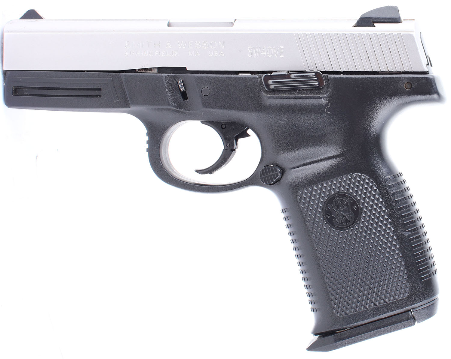 Smith & Wesson, SW40VE, CAL: 40 SW, MFG: Modern, SN: RAN6696, Semi Auto Pistol. 3 3/4'' barrel. The textured plastic grip frame is in excellent condition with some wear. The stainless finish on the slide rates 99%. Bore is excellent. Mechanically solid with very little side to side play in the slide. 3 dot white combat sights, front sight is pinned to the slide, rear sight is set into a dovetail cut. Comes with one 14 round magazine. FFL Req. - Value: 100 to 300