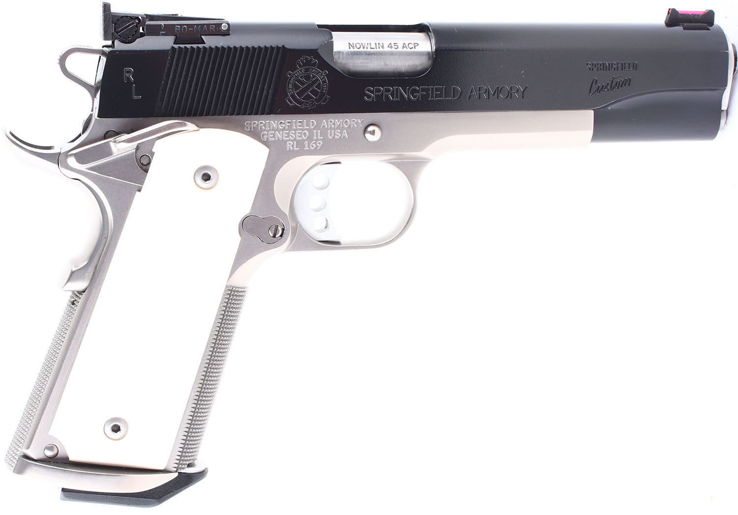 CASED Springfield Armory, Legend Series 1911 A1, CAL: 45 ACP, MFG: Modern, SN: RL 169, Semi Auto Pistol. 5'' barrel. The ivory grips are in excellent condition. The stainless finish on frame rates 99%, and the black finish on the slide rates 97% with some wear and small scratches. Bore is excellent. Mechanically excellent with no perceptible side to side play in the slide. Target sights set in dovetail cuts, blacked out windage and elevation adjustable rear sight, red fiber optic front sight. The gun comes with a Nowlin barrel installed (these barrels typically go for around $250), and aftermarket ivory grips marked on the inside ''Handcrafted for Colt Firearms'' (Ivory 1911 grips tend to go for approximately $500-$700). Comes in a S.A hard plastic case with one magazine, various alan keys and tools, a bore brush, and an owners manual and other related paperwork. FFL Req. - Value: 1500 to 2500