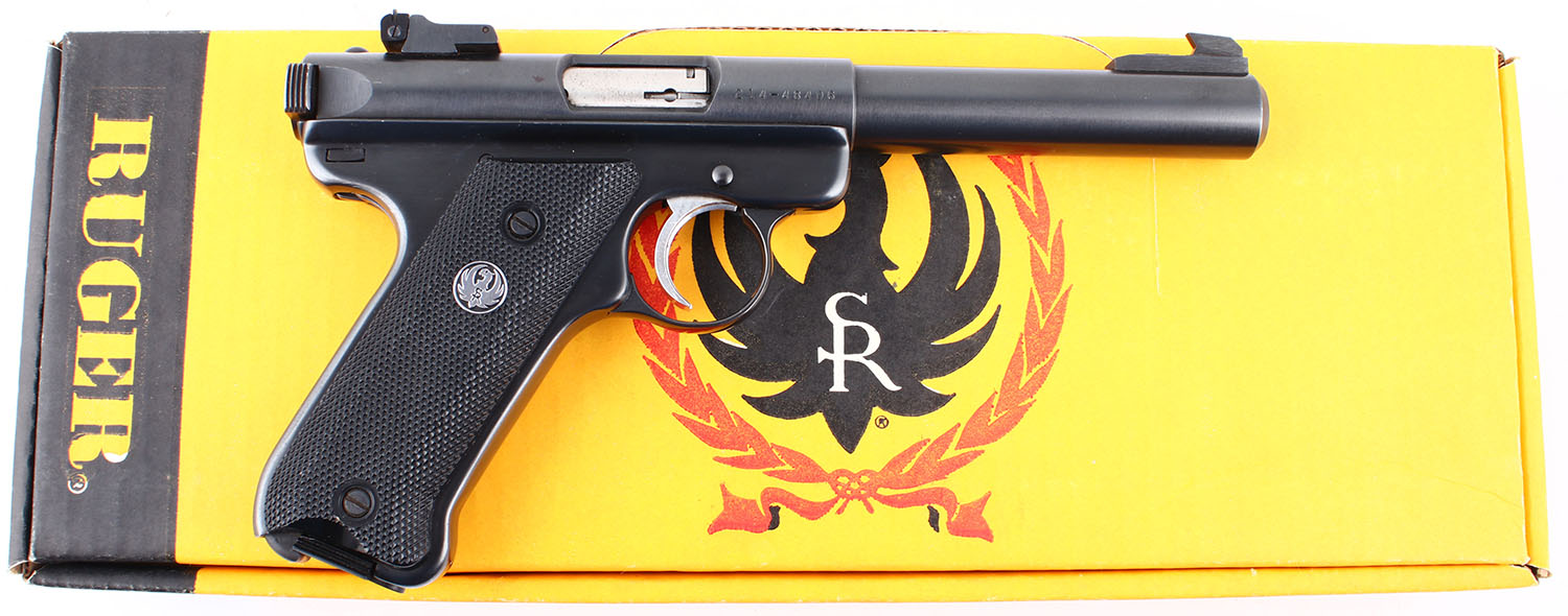 BOXED Ruger, Mark II Target, CAL: 22LR, MFG: 1988, SN: 214-48406, Semi Auto Pistol. 5 1/2'' barrel. The checkered plastic grips are in excellent condition with slight patina on the grip screws. The frame and slide rate 97%, there are a few small splotches of rust on the finish of the slide and frame. Bore is excellent. Mechanically solid. Blacked out target sights, front sight is screwed to the top of the barrel, the rear windage and elevation adjustable sight is set in a dovetail cut on the barrel. Comes in the factory box, with the protective outer box, two magazines, an owners manual, and other related paperwork. FFL Req. - Value: 250 to 500