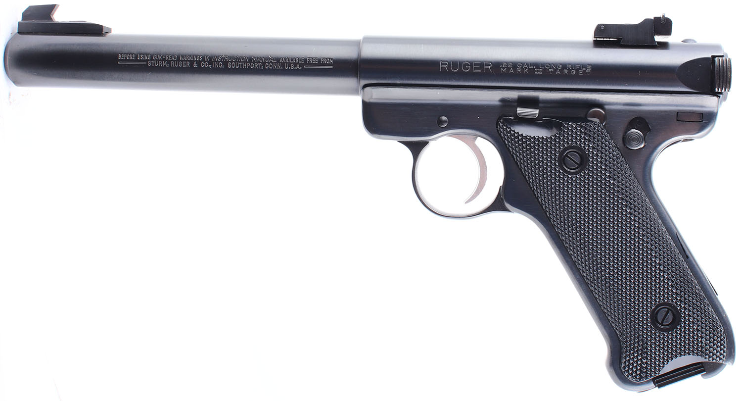 Ruger, Mark II Target, CAL: 22LR, MFG: Modern, SN: 210-40445, Semi Auto Pistol. 6 3/4'' barrel. The checkered plastic grips are in excellent condition. The finish on the barrel and framerates 99%. Bore is excellent. Mechanically solid. Blacked out target sights, front sight is screwed to the top of the barrel, the rear windage and elevation adjustable sight is set in a dovetail cut on the barrel. Comes with a magazine. FFL Req. - Value: 250 to 500