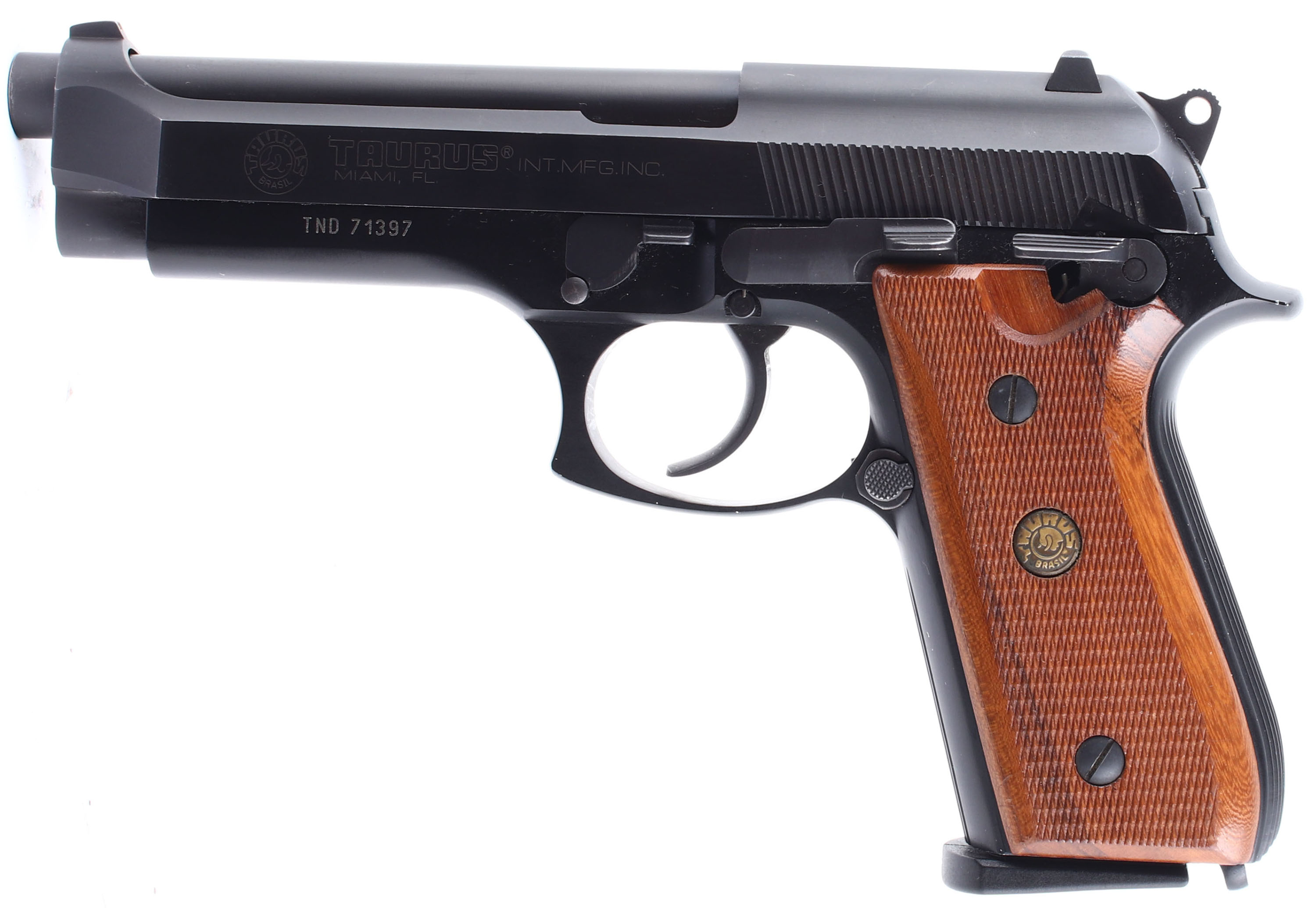 BOXED, Taurus, PT 92 AF, CAL; 9x19mm, MFG: Modern, SN: TND71397, Semi Auto Pistol, 4 3/4'' barrel. Factory markings. The original checkered wooden grips are excellent. The black metal finish on the barrel rates 99%, while the matte black finish on the frame rates 98%. Bore is excellent. 3 dot white combat sights, with integral front sight. Comes in factory box, with one factory 10 rd Mecgar mag & two extra 10 rd pro mags. FFL Req. - Value: 250 to 500