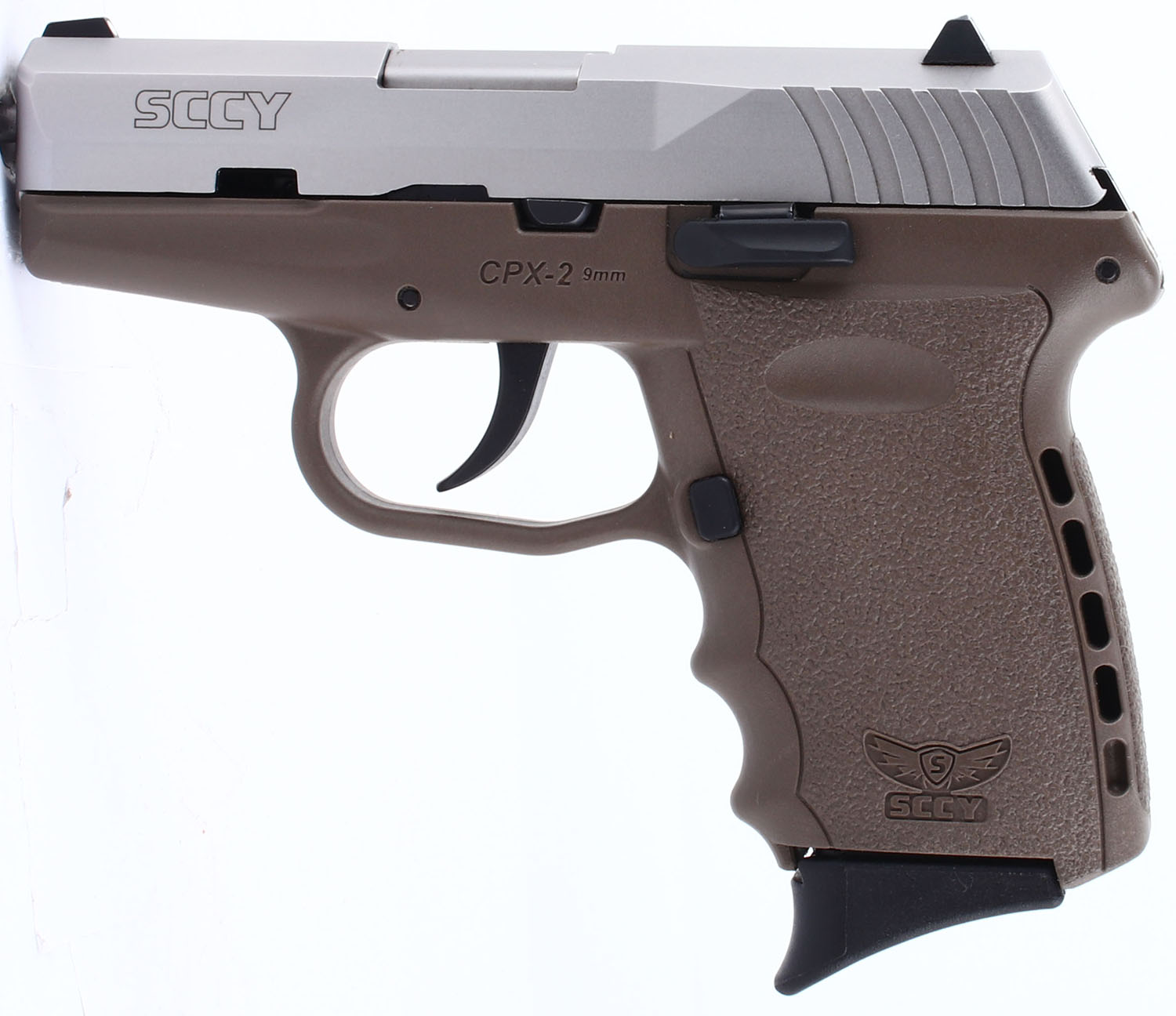 Sccy, CPX-2, CAL: 9x19mm, MFG: Modern, SN: 631828, Semi Auto Pistol, double action only. 3'' barrel. The FDE textured polymer frame is excellent. The metal gray finish on the slide is excellent, rating 99%. Bore is very good, with some roughness on the lands near the crown of the barrel. Mechanically solid. 3 dot white combat sights. One 10 round magazine included. FFL Req. - Value: 100 to 200