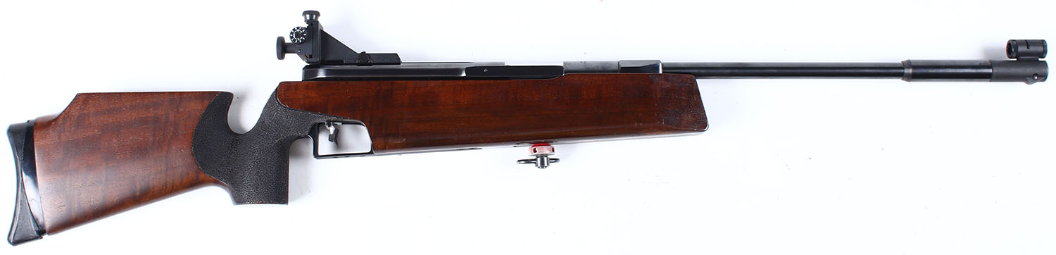 Feinwerkbau, Model 300 S Pellet, CAL: 4.5mm or .177, MFG: 1997, SN: 377364, Pump, 20'' barrel. Oberndorf Germany. Imported by Beeman. A high-quality, recoilless, sidelever, spring-piston air rifle, primarily designed for competitive 10-meter target shooting. It is known for its precision, reliability, & robust construction. The Model 300 S utilizes a unique system that cancel out recoil, making it ideal for precision shooting. The cheeked & textured vertical pistol grip target stock is excellent. The metal blue finish rates excellent. Bore is excellent. Fitted with a micrometer adjustable rear sight & silhouette front sight. Fully adjustable trigger. Stock is fitted with a solid recoil pad & accessory rail. Bore is excellent. The 300 S is a highly praised target rifle known for its recoil-reducing mechanism, accuracy, & construction quality, making it an excellent choice for competitive shooting & serious airgun enthusiasts. Overall excellent. No FFL Req. No FFL Req. - Value: 200 to 600