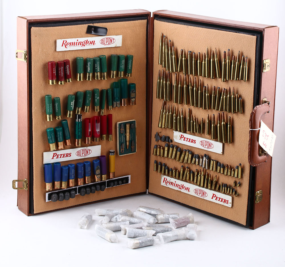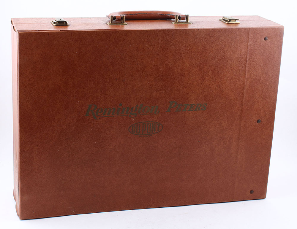 RARE! Remington/Peters/Du Pont Salesman Sample Briefcase. Made beginning in 1960, this is a Salesman's Sample Display all fitted in a luggage type case containing all the original dummy ammo as displayed in the pictures. This was used to set up in stores or vendor sales to display various Remington-Peters ammo offerings of the era. The case remains in amazingly great condition with all original contents intact. Case measures 21'' x 15 1/2'' x 5 1/2'' closed. Contents show a bit of scattered shelf soiling. This salesman briefcase has a variety of cartridges including, centerfire, rimfire, shotshells, window shells & bullets. It folds out to display each set individually, or as a whole. Some of the shotshell cartridges still have protective wrapping on them. This is the first time we have seen this set! Former RSA president Roy Marcot believes there was between 12 to 20 Remington field salesmen nationwide at the time & that its possible one was made for each salesman's use. This would likely limit total sets to 20 or less. The briefcase itself is in excellent condition, both inside & out. A wonderful opportunity to own such a rare & complete salesman sample set! * Grade: Excellent + - Value: 4000 to 6000