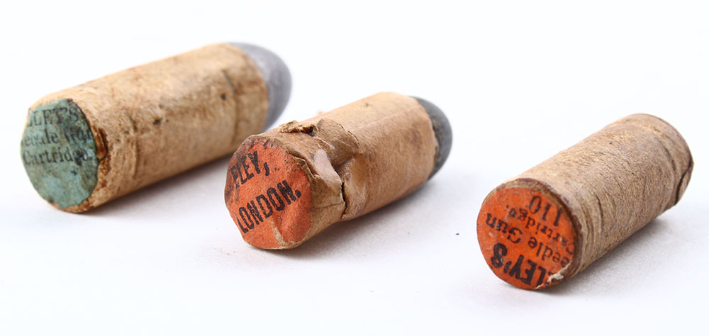 Lot of 3. Needlefire Cartridges. (1) 75 Bore (.41 caliber), HS:''ELEY'S Needle Gun Cartridge'' on bluish green paper tab, RN Lead. (1) 90 Bore (.38 caliber), HS:''ELEY, LONDON'', on orange paper tab, RN Lead. (1) 110 Bore (.34 Caliber), HS:''ELEY's Needle Gun Cartridge'' 110 on orange tab. Rnd ball Lead. Grade: Very Good - Value: 40 to 80
