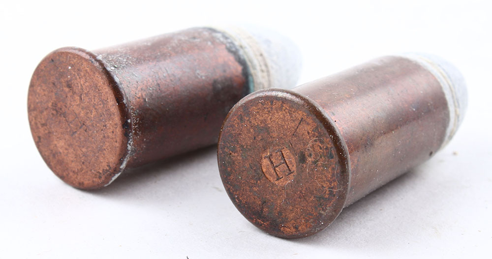 Lot of 2. (1) 56-52 Spencer. HS:''H'' raised in a circle. FN Lead. (1) 56-56 Spencer. HS:''H'' impressed, PT Lead. Both bullets frost. Grade Good - Value: 20 to 40
