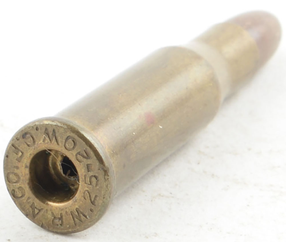 .218 Bee. HS:''W.R.A. Co. 25-20 W.C.F.'' CJ HP FMJ. A prototype for the 218 Bee. Grade: Very Good - Value: 50 to 100
