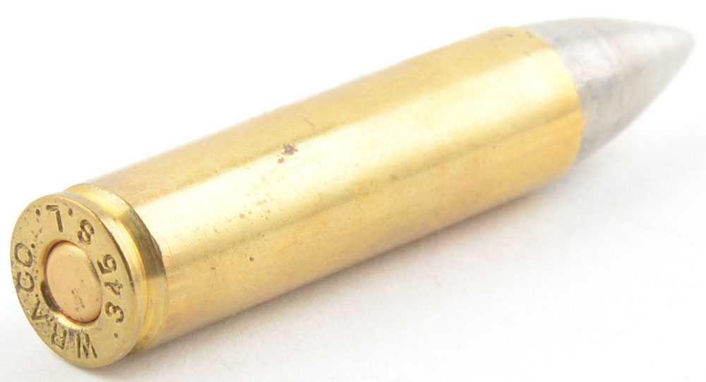 .345 Machine Rifle. HS:''W.R.A. Co. .354 S.L.'', PT CN FMJ. This cartridge is believed to have been made in South Africa for collectors who wished to have an example of this rare cartridge but are unable to obtain one. This one does NOT have a small R on the side of the case indicating a replica. Grade: Excellent - Value: 20 to 40