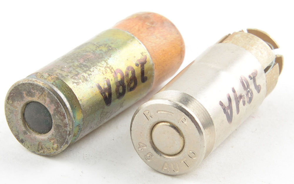 Lot of 2 = 45 ACP shot, F A 43, round copper primer, plated steel case, oal 1.370 shorter version, only 400 made, wood sabot, R - P 45 AUTO, delayed shot, 4 piece bullet held together with fishing line, shot inside a segmented bullet sections. Grade: Excellent - Value: 110 to 170