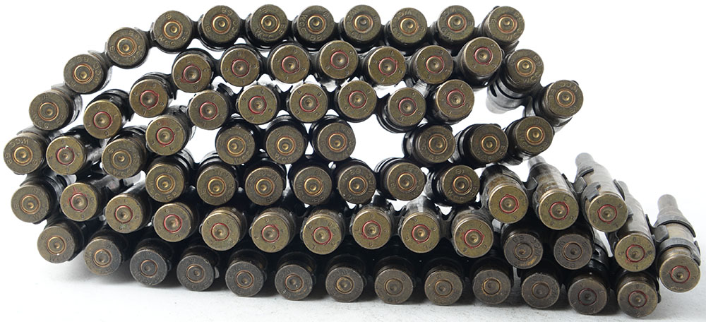Lot of 42 fired cases and 33 long neck blanks (7.62 NATO) all on Machinegun Links. Grade Good - Value: 10 to 20
