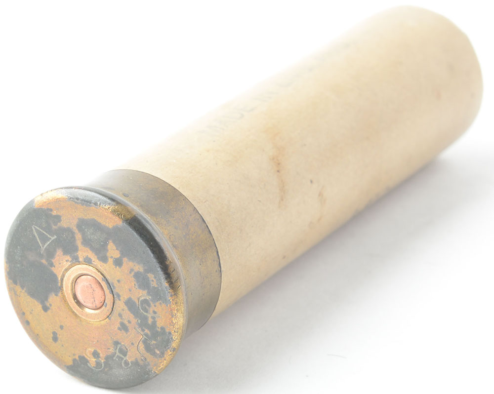 J.P.S. No. 4, 4ga, loaded tan paper shot shell, 3 7/8'' OAL, shell is solid. Grade: Excellent - Value: 20 to 80