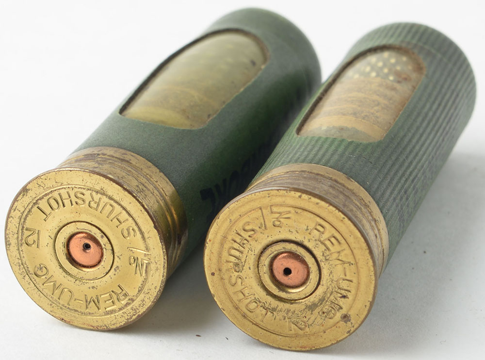 Lot of 2 Window Shells, both H/S= ''Rem-UMC No 12 Shurshot'', both 2 1/2'' OAL, salesman sample in green paper case. Grade: Very Good ++ - Value: 20 to 80