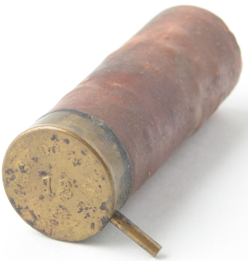 12 Gauge Pinfire. HS:''C D LEET SPRINGFIELD 12'' raised, Brass cup & Red paper case. Grade: Good - Value: 50 to 100