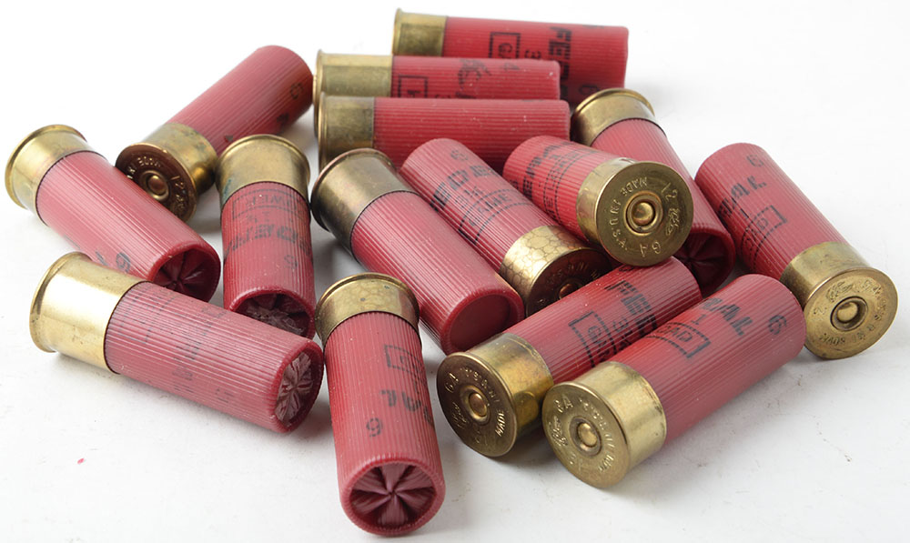 Lot of loaded plastic shotshells, red paper cases, 12ga, 2 5/16'' OAL. Grade: Excellent - Value: 6 to 50