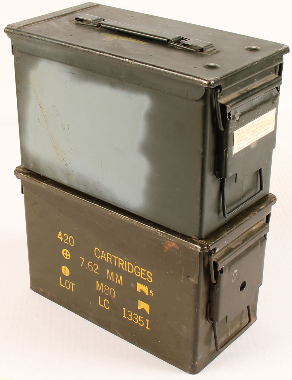 | Lot of two M2A1 .50 Cal metal ammo cans, both empty, insides of ...