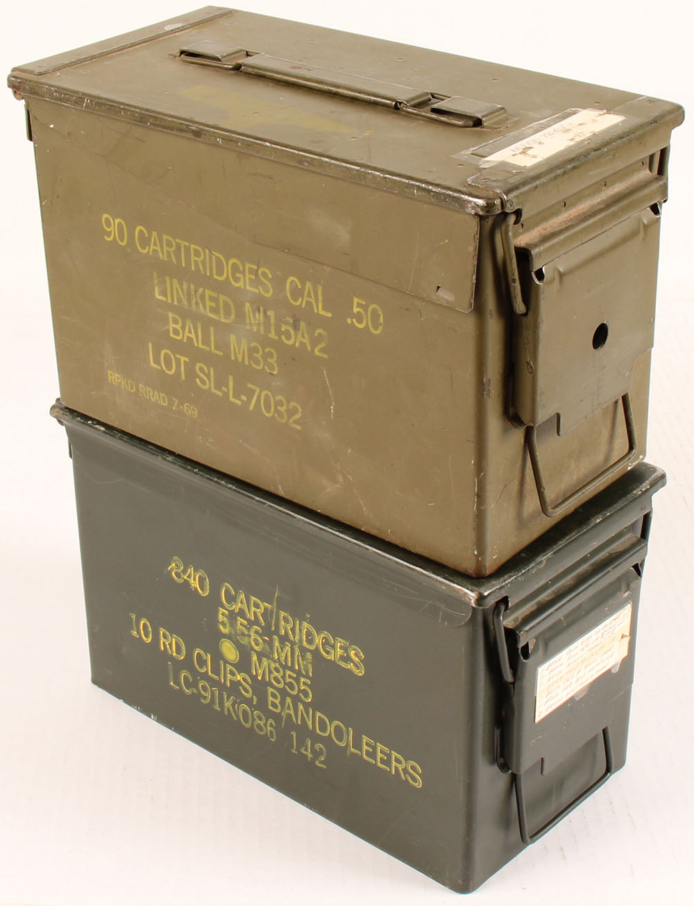 | Lot of two M2A1 .50 Cal metal ammo cans, both empty, insides of ...
