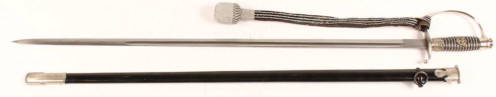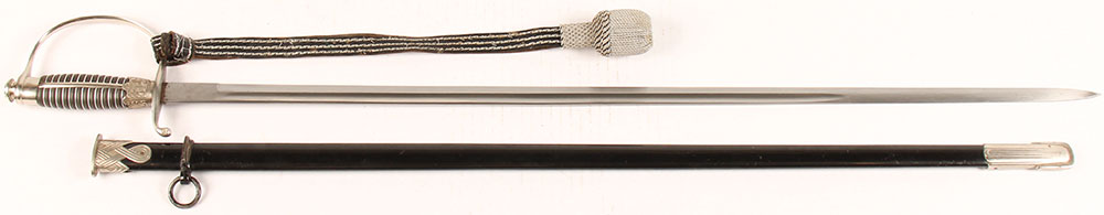 Genuine World War II German Police Officer's Degen (Epee) Dress Sword, made by Paul Weyersberg of Solingen. It is still in very good used condition, as having been worn many times, but not abused. The nickel plating throughout the fittings & the ''D'' guard is still bright & in great condition. The pommel cap has excellent serrations & no sign of improper removal. The ''D'' guard is in wonderful condition, ending in the usual teardrop quillon. The ferrule is crisp & decorated with six standing oak leaves separated by acorns. The ebony grip is in excellent condition, tightly wrapped with nickel wire & with a fine cover plate on the reverse. The inset Police Civic eagle insignia is also in fine condition & appears to be of aluminum (Does not take a magnet). The scabbard is in very good condition. It has original paint, which shows some age or light wear. The lower scabbard mount has a decorative pattern of lines & retains almost all the nickel plate. The dome headed retaining screws are excellent. The 31 3/4'' blade is in solid gem condition, with the standard matte finish. It has a nice double fuller, which shows some age, but very little staining or wear. It has original ''Porteppe''. Paul Weyersberg produced blades in Solingen, the legendary ''City of Blades'' in western Germany. The reverse ricasso is marked PAUL WEYERSBERG & Co. / SOLINGEN in double ovals around the firms trademark ''Sword-&-Wreath'' logo, which was the only marking they used during the NSDAP era. The original leather blade washer is unfortunately missing. These police swords are quite rare & desirable, especially ones this nice. Ready to add to your collection & display! Grade: Excellent + - Value: 600 to 1200