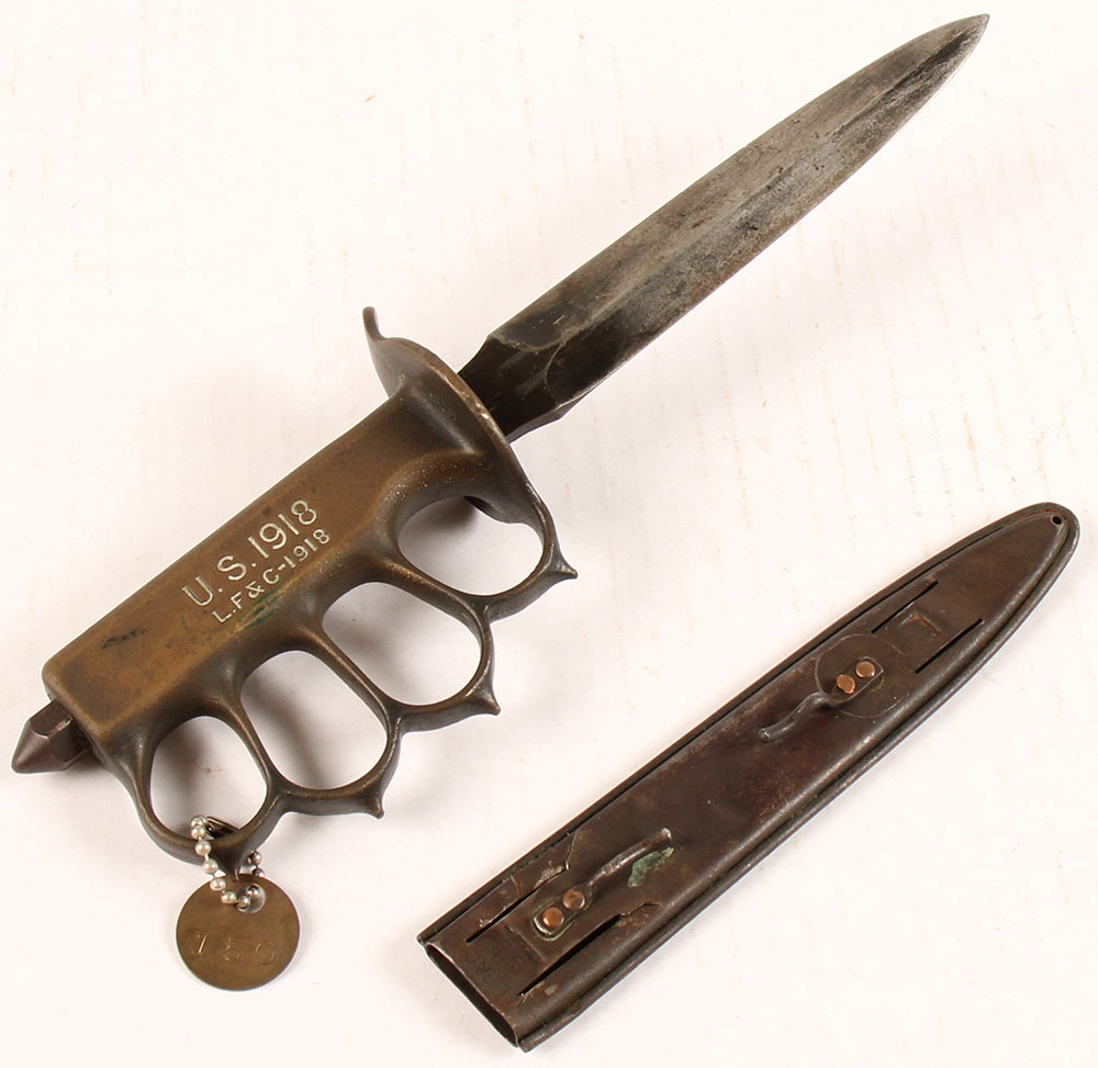 CONDITION: Right side of the handle is marked ''U.S. 1918'' over ''L.F & C-1918''. Has a brass hang tag stamped ''150''. Blued steel blade, has sheath/use wear & scratches but retains about 40% of its blue, does have some light scattered roughness at the tip & ricasso. Cast bronze handle that was chemically blackened. Some the blackened finish has worn away in common handling areas showing the bronze color underneath, thinned blacked finish remains in protected areas around the guard & knuckle holes. Steel nut on the pommel that holds blade in place has some small scuffs & starting to tone brown. the steel sheath is marked ''L.F.&C.'' over ''1918''. One side of sheath has complete toned brown, the other side is a mix of gun metal gray with speckled brown patina. Grade: Very Good ++ - Value: 1000 to 2000