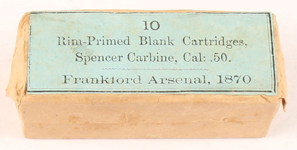 Frankford Arsenal, .50 Spencer carbine Blanks, 1pc, FULL & SEALED with opening string, buff box with blue label & black print, box is solid with minor age soiling on one side, & light rub wear on the top label & edges/corners. Grade: Excellent + - Value: 60 to 120