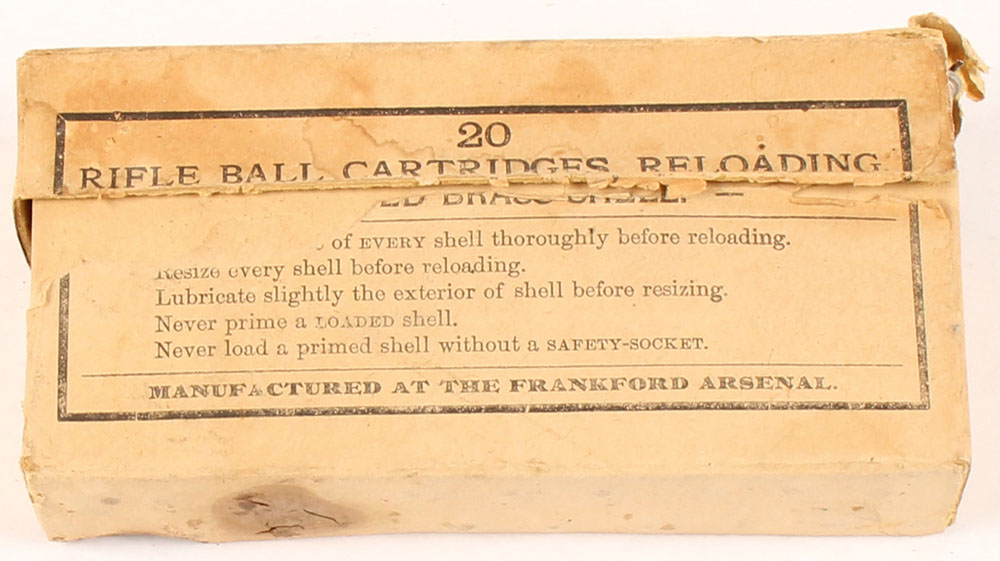 Frankford Arsenal, Rifle Ball Cartridges .45-70 Government, Tinned Brass Shell, Manufactured to be reloaded, Full 20rds., ''F 92 4'' H/S, 2pc. Buff box & label with black printing, box is missing right end of lid, part of front label on bottom box, hole on bottom with a split & partial split seam, as well as some bullet indents, age soiling spots on bottom & light age soiling on the top & front label, rub wear to label & edges/corners, ammo ranges from good to poor, most cases have corrosion on H/S & some on sides of case, lead bullets are oxidizing. Grade: Good ++ - Value: 20 to 40