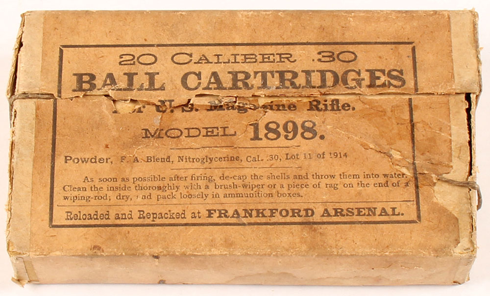 Frankford Arsenal, .30 Ball for magazine rifle M1898 (.30-40 Krag), date stamped ''OCT 26 1914'', powder lot 11 of 1914, Full, mixed dated H/S all hare ''FA'' or ''F'' marked, likely reloaded cases from the factory & how the box shipped, box has the opening string, 2pc, buff box & label with black print, box has two split seams on the right end of bottom box, one split seam on the left end of bottom box, three split corner seams on the top box, age soiling & rub wear on labels & edges, ammo is very good. Grade: Very Good - Value: 20 to 120