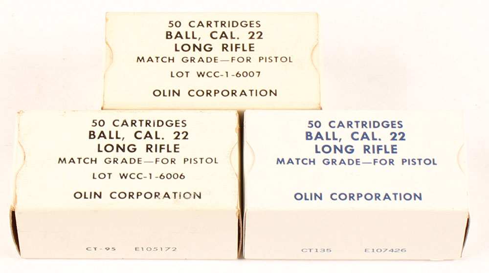 Lot of three, Winchester/Olin, .22 LR Ball, match grade for pistol, all full, 50 Rd. boxes, 1pc, boxes are solid with light rub wear, ammo is very good. Grade: Excellent - Value: 10 to 30