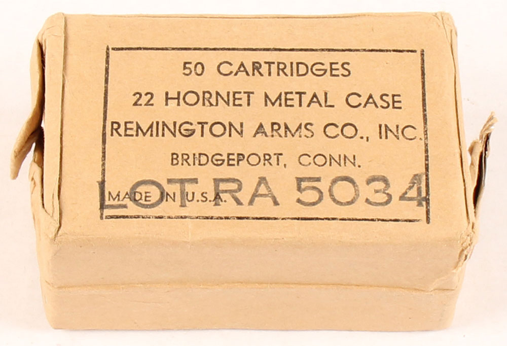 Remington, .22 Hornet, Lot RA 5034, foil wrapped box, FULL & SEALED, 50 Rd. box, 1pc, Foil wrap has one small tear in the bottom right corner of front label, & only light rub wear. Grade: Excellent + - Value: 30 to 60