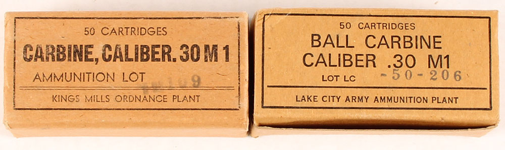 Lot of two, .30 Carbine M1, 50 Rd. ammo boxes, Kings Mills & Lake City, both full, Kings Mills box is SEALED, brown boxes with black print, boxes are solid with light rub wear, ammo in Lake city box is excellent. Grade: Excellent ++ - Value: 50 to 100