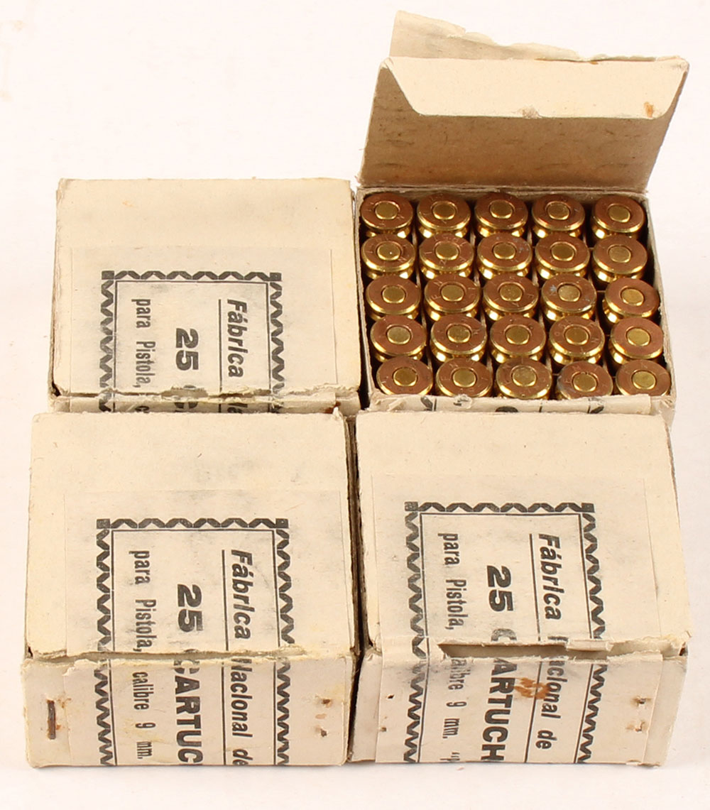 Lot of four, Fabrica Nacional de Toledo (Spanish), 9mm Parabellum (9x19mm), 25 count boxes, brass case, all full, ''F N T 1951'' H/S, white boxes with white & black labels, boxes are solid with rub wear & light age soiling, ammo is very good, possibly has corrosive primers. Grade: Very Good ++ - Value: 20 to 40