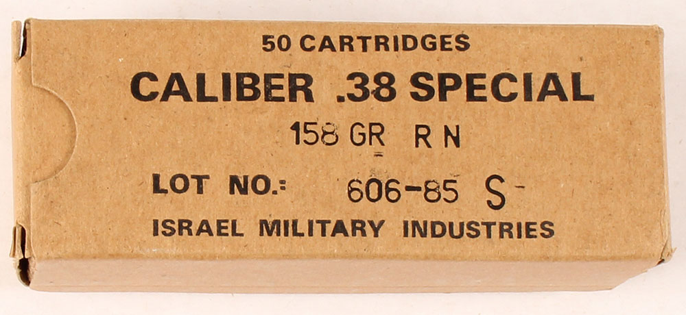Israel Military Industries (IMI), .38 Special, 158 Gr Rn bullet, Lot No 606-85 S, 50 Rd. box, full, brown box with black print, box is solid with light rub wear, ammo is very good. Grade: Excellent - Value: 20 to 40