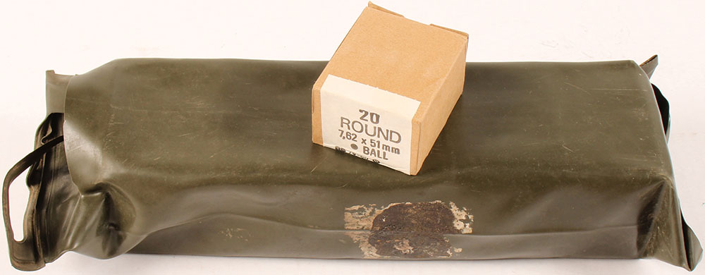 Portuguese, 7.62 x 51mm Nato Ball, lot BF 79-80 (same as H/S), 200 Rd. battle pack, cut open, FULL 200 Rds. With ten 20 Rd. boxes, ammo is excellent. Label on battle pouch has fallen off. Grade: Excellent - Value: 100 to 200