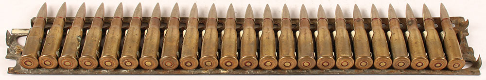 French, 8mm Lebel, on steel strip for Hotchkiss Mle 1914, 23 Rds., strips have rust, ammo rages from good to fair. Grade: Good + - Value: 10 to 50