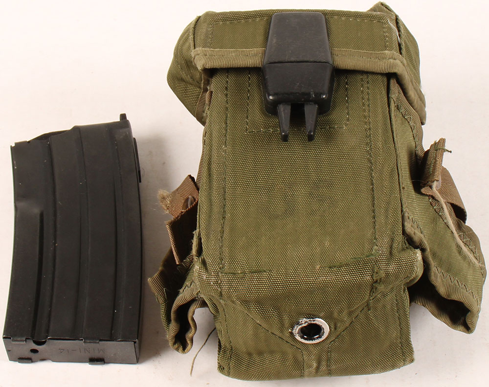 US, LC1 Alice, M16 mag pouch, Nylon, can hold three 30 Rd. M16 Mags, has two pouches on the sides for grenades, comes with three 20 Rd. Ruger Mini-14 mags. Grade: Excellent - Value: 30 to 60