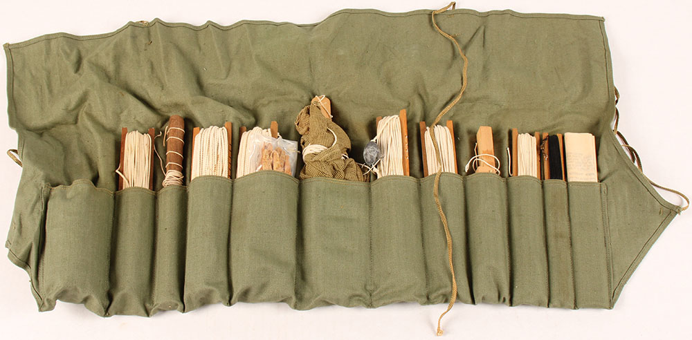 US, WW2, complete Emergency Rafe escape & survival fishing kit, has strobe light, line sets, hooks, weights, knives, instruction manual & other fishing accessories. The cases have some stains & rub wear but have no tears or split seams. Grade: Excellent ++ - Value: 50 to 200