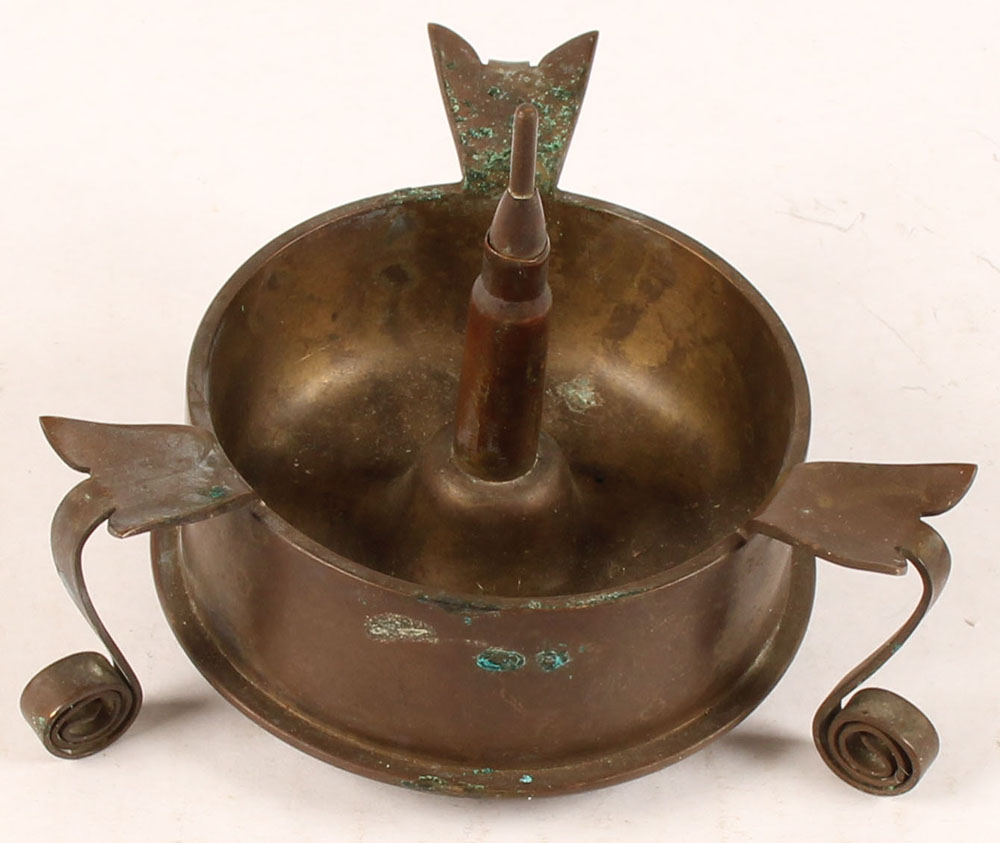 Trench art made from brass artillery shell & spent rifle case. Has a dark patina & spots of green corrosion. Grade: Very Good - Value: 4 to 20